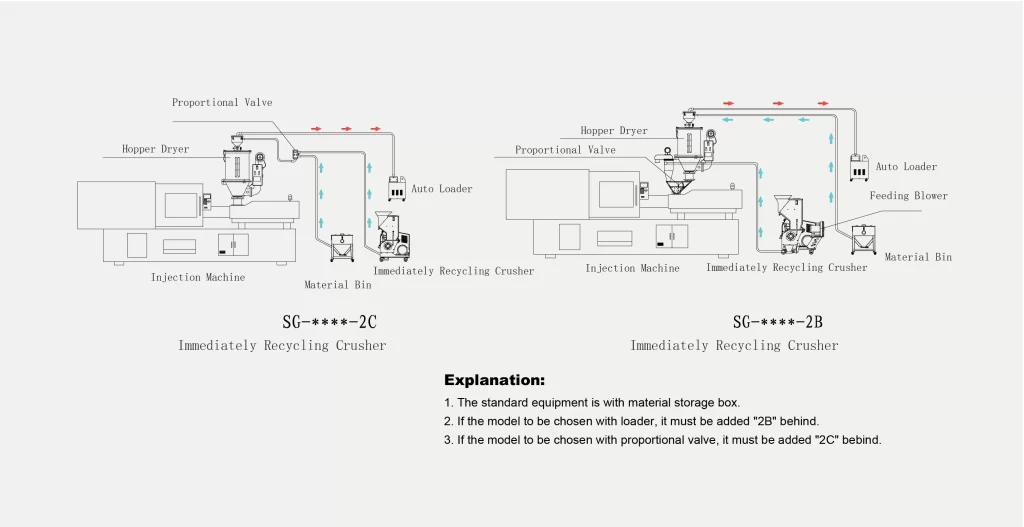 • The device is applicable to the Injection molding machine besides, matching with the Extruding machine or the Belt conveyor to crush the runners or a small quantity of defective products.
